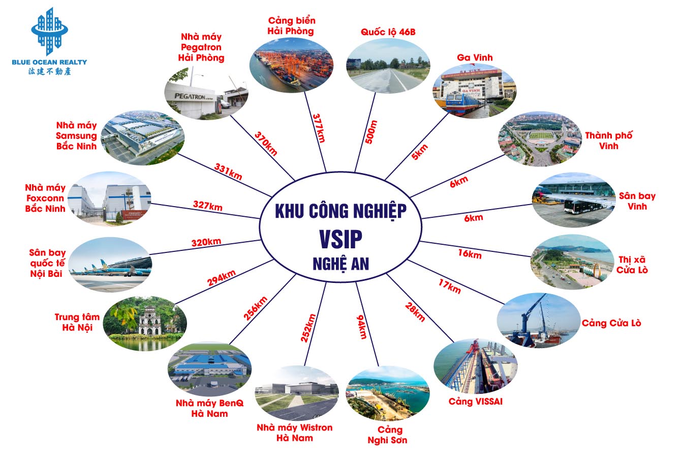 Vị trí Khu công nghiệp – Đô thị và dịch vụ VSIP Nghệ An tọa lạc tại cửa ngõ phía Tây thành phố Vinh, với các tuyến đường huyết mạch bao quanh như quốc lộ 1A, quốc lộ 46A, quốc lộ 46B và Đại lộ Vinh – Cửa Lò, từ đây có thể dễ dàng tiếp cận nhanh chóng các cảng biển, cảng đường bộ và cảng hàng không do đó tiết kiệm được nhiều chi phí và thời gian vận chuyển, đặc biệt là chi phí xuất nhập khẩu hàng hóa.